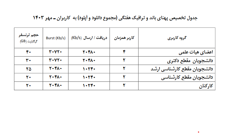 میزان پهنای باند و حجم تخصیص داده شده به کاربران در گروههای مختلف در جدول پیوست درج شده است.