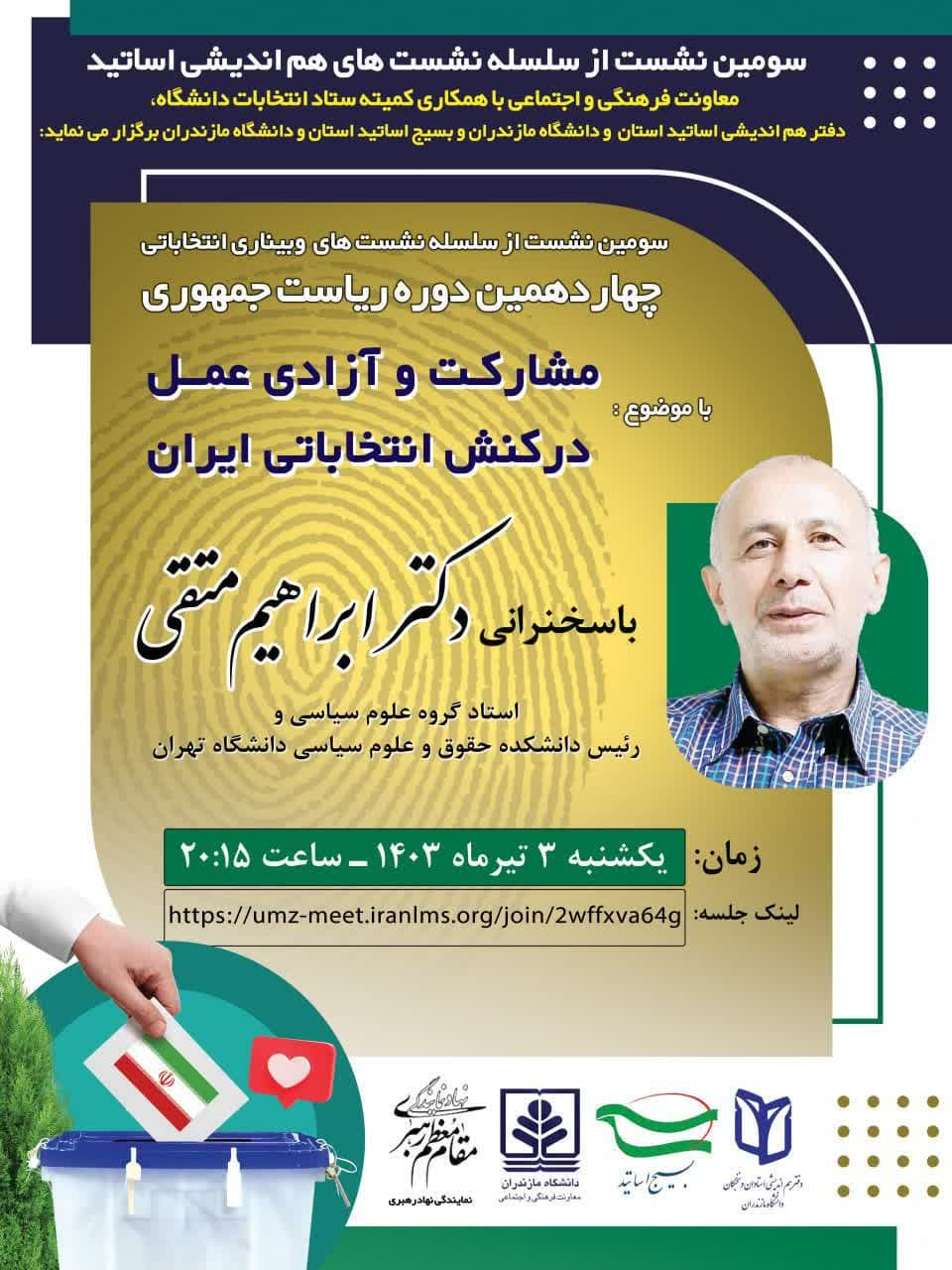 سومین نشست از سلسلهنشستهای وبیناری انتخاباتی چهاردهمین دوره ریاست جمهوری با موضوع:"مشارکت و آزادی عمل در کنش انتخاباتی ایران" - دانشگاه مازندران