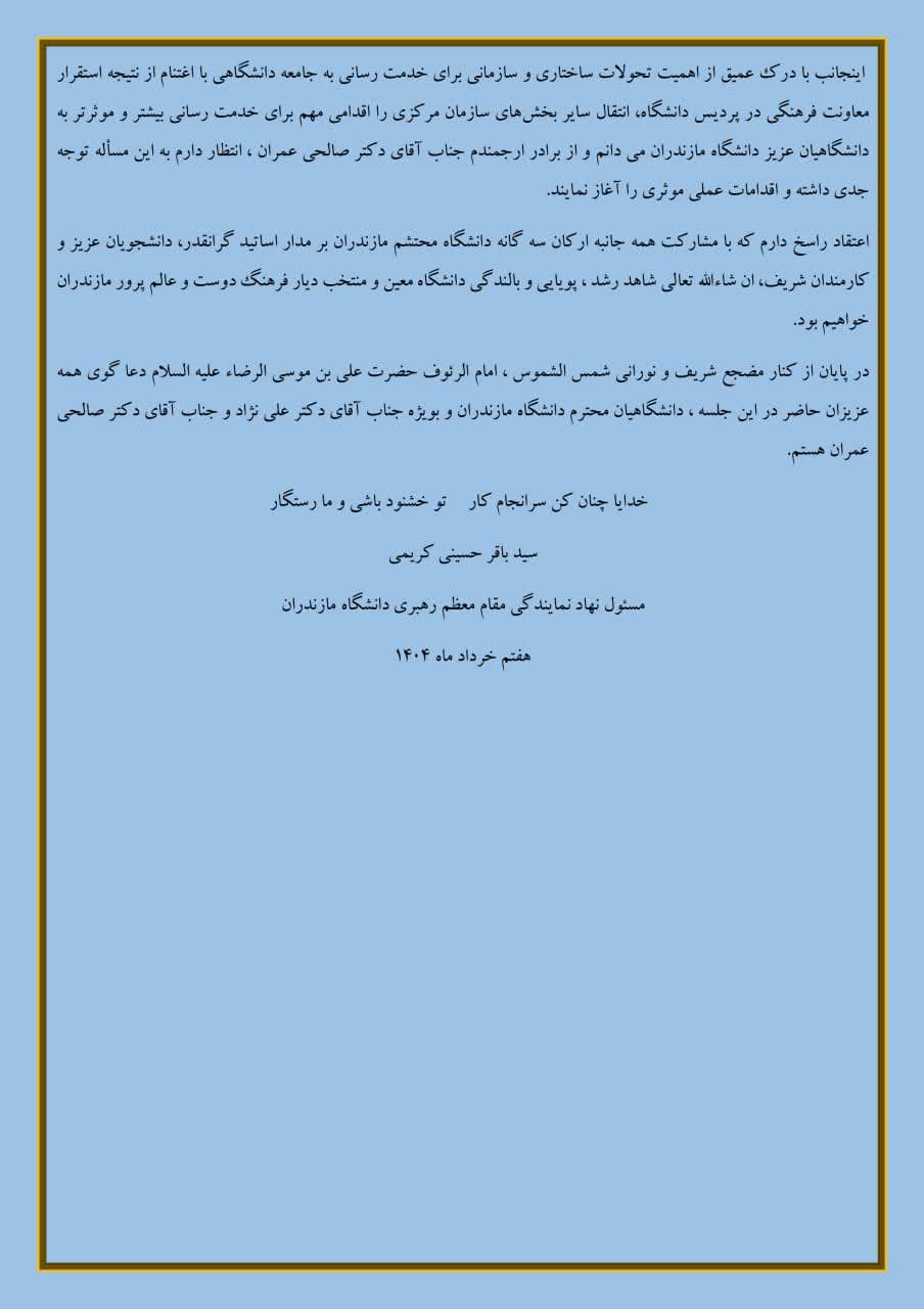 همچنین حجتالاسلام اسلامی، معاون نهاد نمایندگی مقام معظم رهبری در دانشگاه، متن پیام دکتر سیدباقر حسینی مسوول نهاد دانشگاه را در این مراسم قرائت و از آمادگی همهجانبه نهاد رهبری در همکاری با سرپرست دانشگاه چهت پیشبرد اهداف توسعه آن خبر داد.