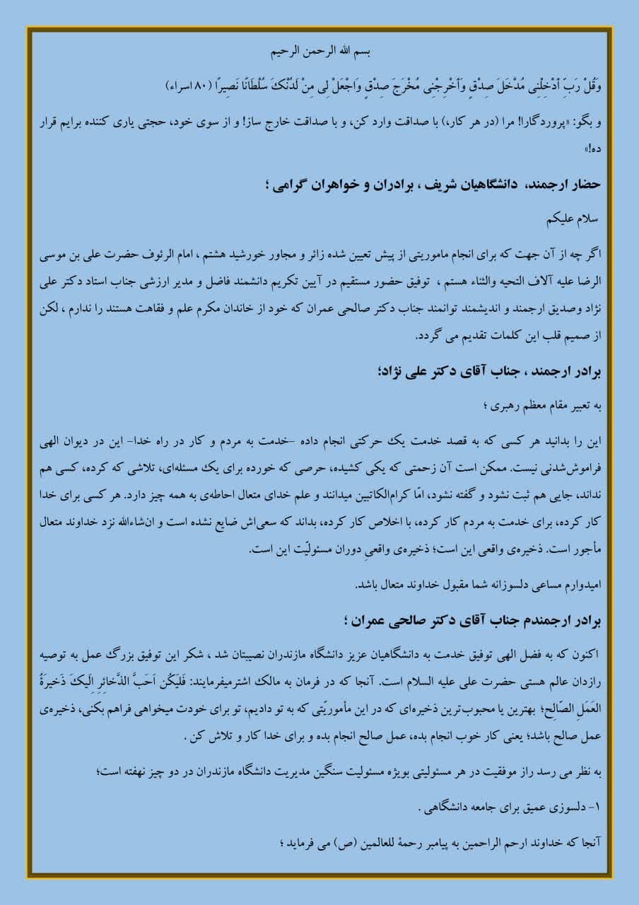 همچنین حکم مسوولیت سرپرست دانشگاه مازندران با امضای دکتر سیمایی صراف وزیر علوم، تحقیقات و فناوری توسط دکتر روشن مشاور عالی وزیر به دکتر ابراهیم صالحی عمران اهدا گردید.