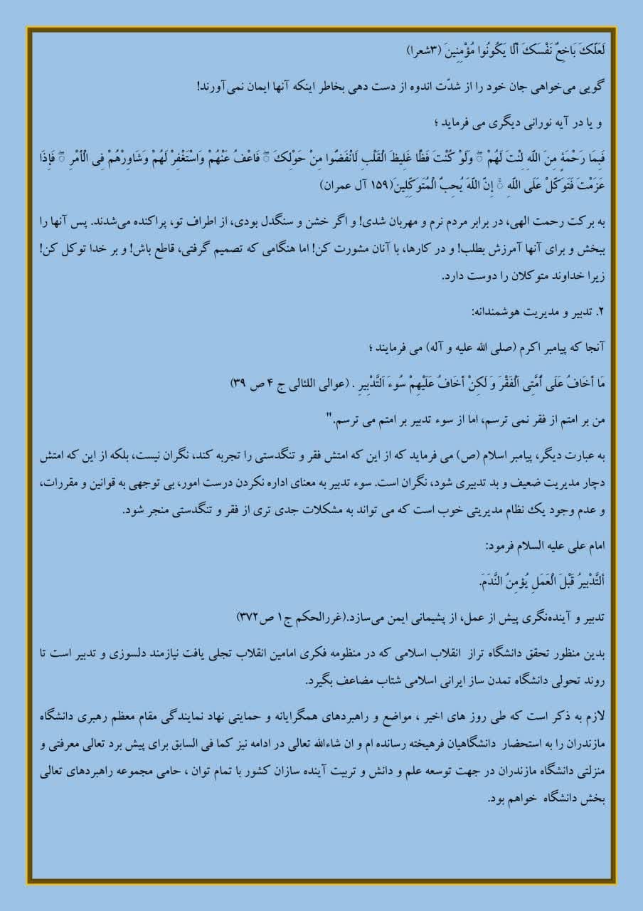 نماینده ولی فقیه در استان مازندران در انتها تاکید کرد: این دروس خداوند، تا روز قیامت برای همه بشریت ضرورت دارد و همه دانشگاهها باید این دروس تقوا، خودشناسی، دشمنشناسی و ... را به دانشجوها بشناسانند. دانشگاهی که خالی از این مسایل و دروس باشد، هر چند در ابزارسازی به اوج برسد، باز هم به کمال نخواهد رسید.