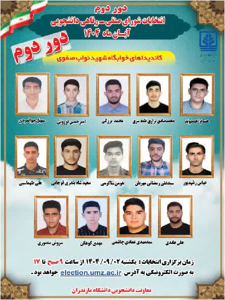 به اطلاع دانشجویان محترم ساکن خوابگاه شهید نواب صفوی میرساند: با عنایت به عدم مشارکت ۲۰ درصدی دانشجویان در انتخابات دور اول شورای صنفی - رفاهی(در تاریخ ۲۵ آبان)، به استناد تبصره ۲ از ماده ۱۸، انتخابات به دور دوم و زمان رأیگیری به روز یکشنبه ۲ آذر ۱۴۰۴ موکول گردید. لذا داوطلبان عزیز تا ۲۴ ساعت قبل از روز اخذ رأی فرصت دارند نسبت به تبلیغات خود اقدام نمایند.