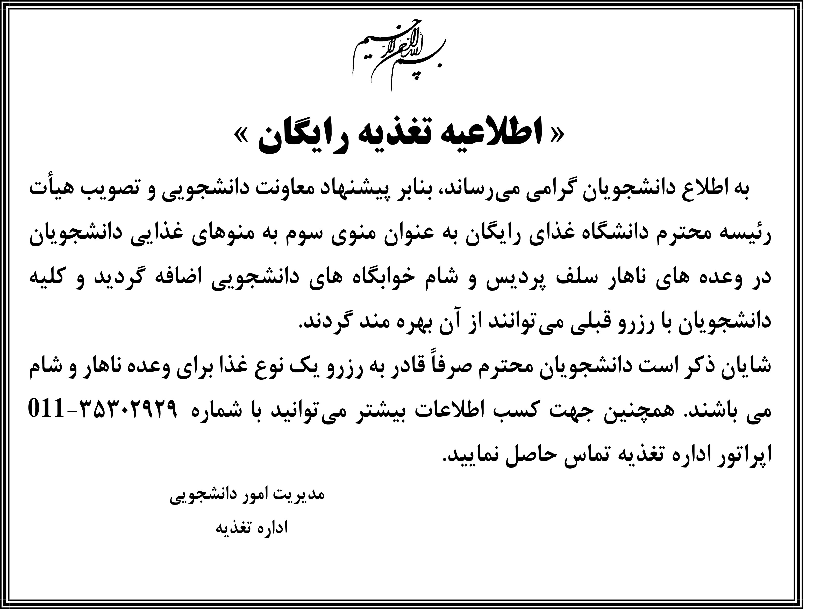 اطلاعیه تغذیه رایگان - دانشگاه مازندران