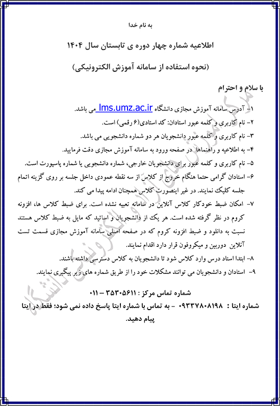 اطلاعیه شماره چهار دورهی تابستان سال 1404( نحوه استفاده از سامانه آموزش الکترونیکی) - دانشگاه مازندران