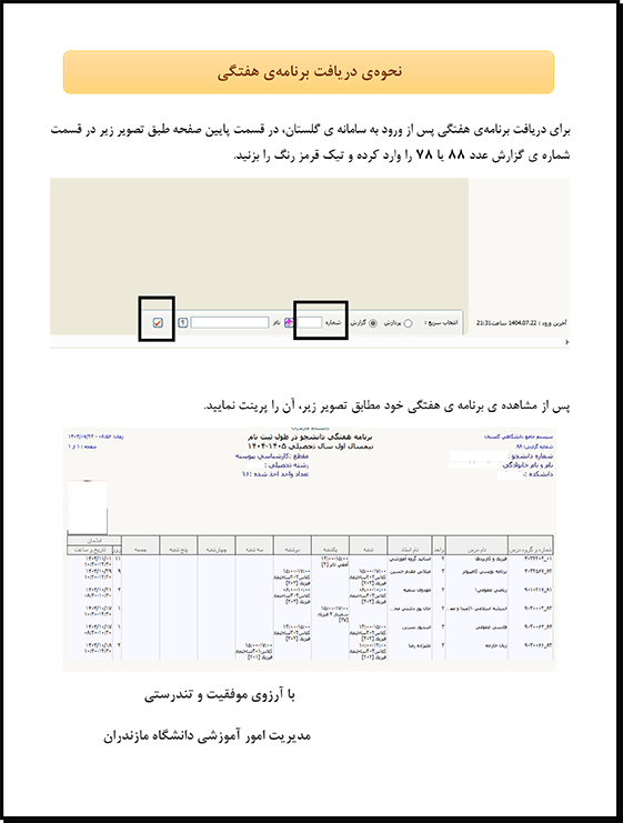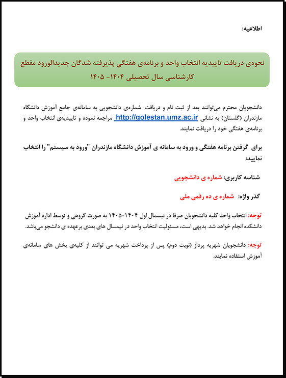 اطلاعیه شماره 5 درخصوص نحوه دریافت تاییدیه انتخاب واحد و برنامه هفتگی پذیرفتهشدگان جدیدالورود 1404 مقطع کارشناسی - دانشگاه مازندران