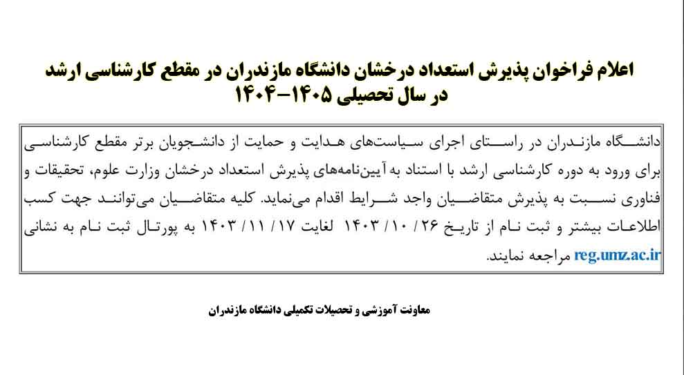 اعلام فراخوان پذیرش استعداد درخشان دانشگاه مازندران در مقطع کارشناسی ارشد در سال تحصیلی 1404-1405