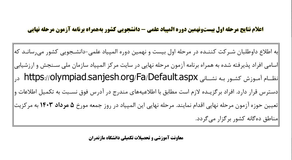 اعلام نتایج مرحله اول بیستونهمین دوره المپیاد علمی - دانشجویی کشور بههمراه برنامه آزمون مرحله نهایی - دانشگاه مازندران