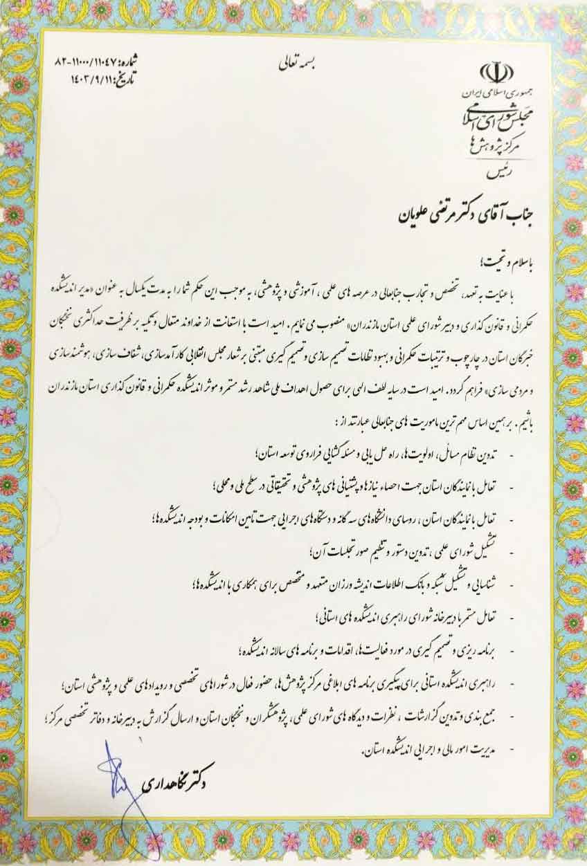 در زیر، متن حکم دکتر علویان مدیر اندیشکده حکمرانی و قانونگذاری مرکز پژوهشهای مجلس شورای اسلامی در استان مازندران را مشاهده میکنید: