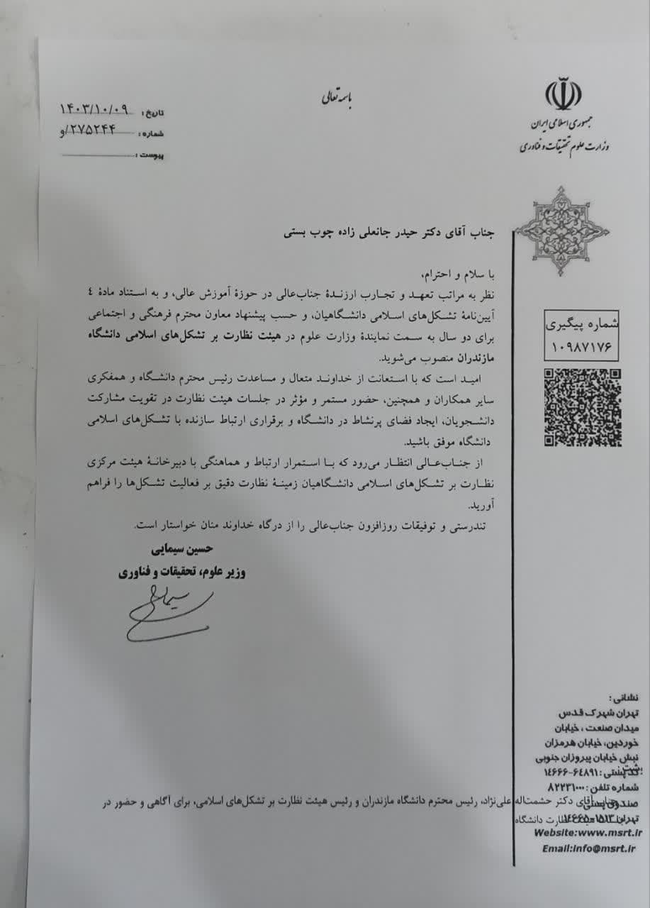 انتصاب نماینده وزارت عتف در هیات نظارت بر تشکلهای اسلامی دانشگاه مازندران