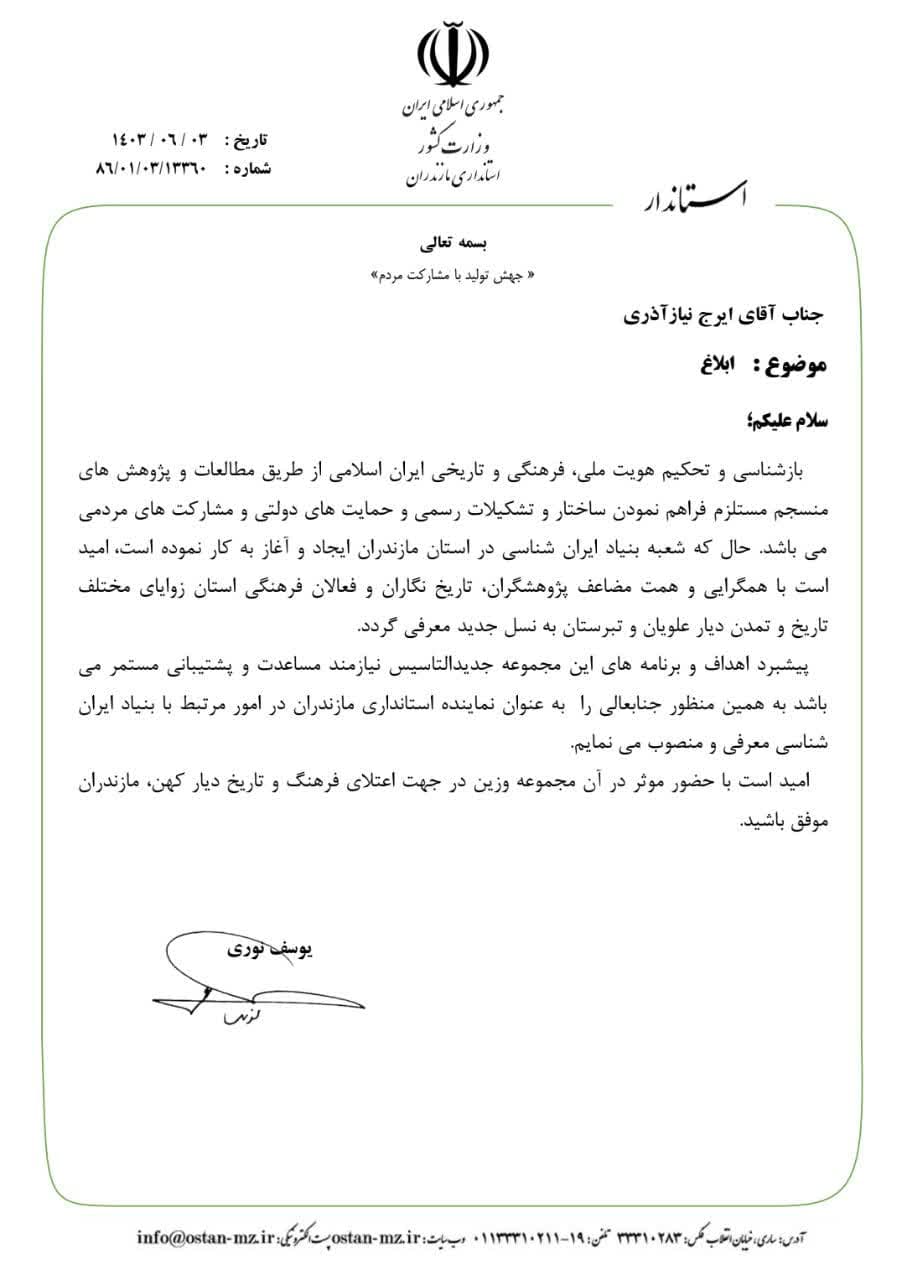 به گزارش روابط عمومی دانشگاه مازندران، دکتر یوسف نوری؛ استاندار مازندران طی ابلاغی، ایرج نیازآذری را به عنوان نماینده استانداری مازندران در امور مرتبط با ایران شناسی منصوب کرد.