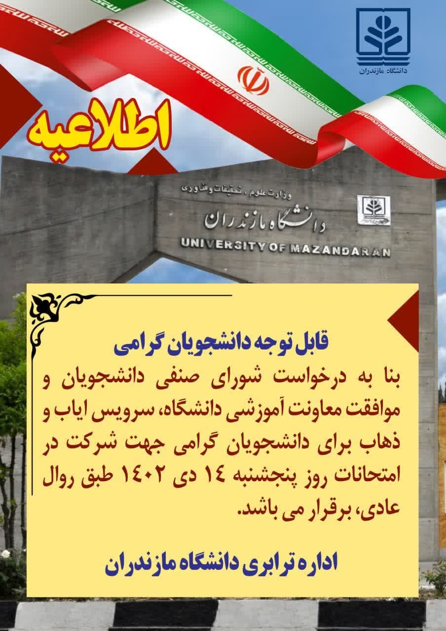 برقراری سرویس ایاب و ذهاب برای دانشجویان جهت شرکت در امتحانات روز پنجشنبه 14 دی - دانشگاه مازندران
