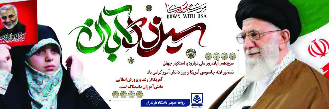 به گزارش روابط عمومی دانشگاه مازندران، همزمان با فرا رسیدن 13 آبان، روز ملی مبارزه با استکبار جهانی و تسخیر لانه جاسوسی آمریکا در ایران، هیات رییسه دانشگاه بیانیهای به شرح زیر صادر کرد: