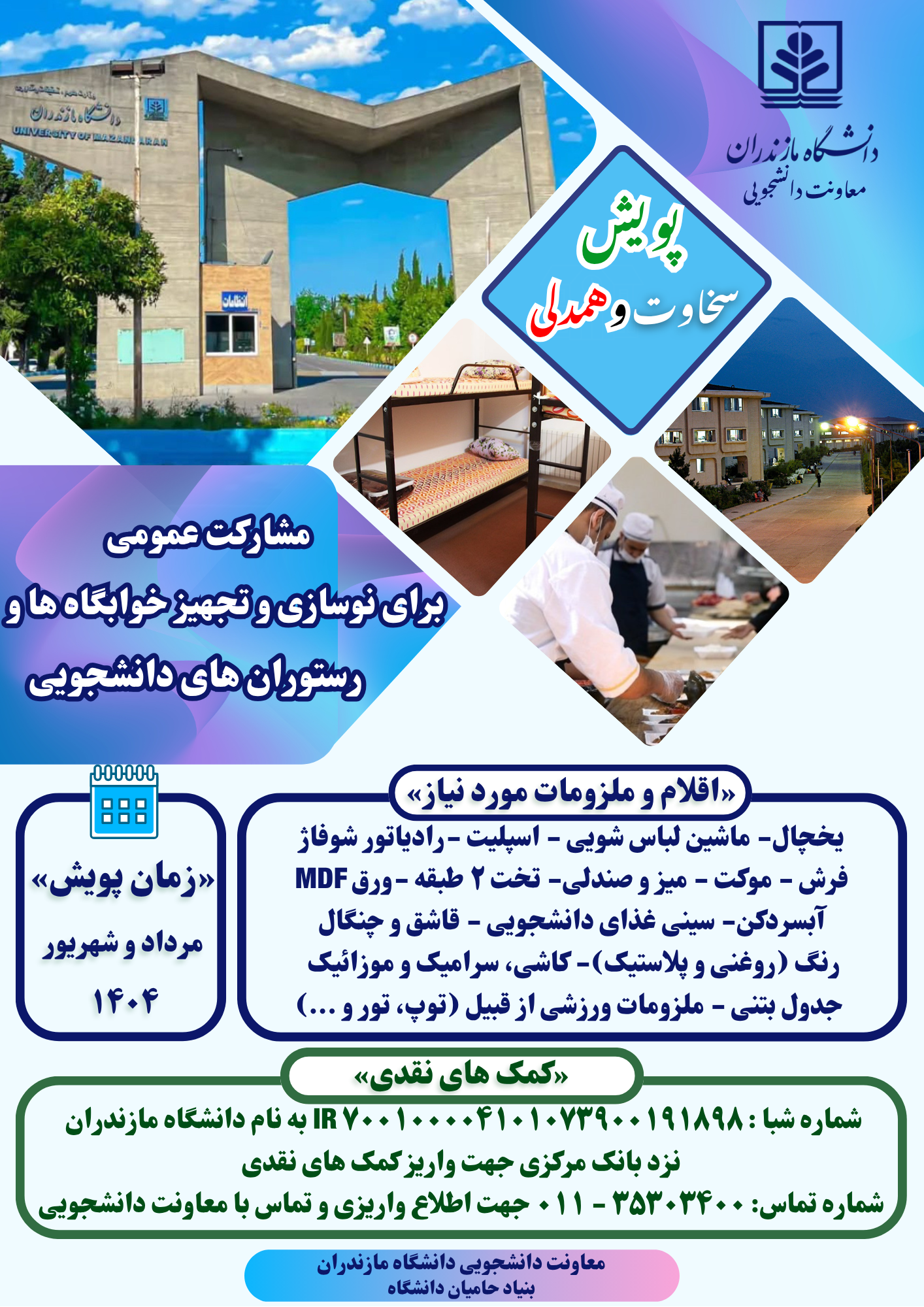 دکتر شعباني: عرصههاي مشارکت در اين پويش خداپسندانه که اتفاقا هزينه خانه خودمان يعني دانشگاه مازندران و فرزندانمان يعني دانشجويان دانشگاه ميشود، بسيار متنوع است. مشارکت در اين امر انساني-الهي حتي ميتواند با کمکهاي مختصر و اندک باشد. ضمن آن، معتقدم برخي از همکاران ممکن است وسایل مازاد در انبار منزلشان و در حد نو باشد و پس از گذشت زمان، فرسوده و مستعمل شود و هم اکنون ميتواند مورد استفاده بهينه و در عين حال مورد ثواب قرار گيرد. همچنين ممکن است همکاران دانشگاهي، شاگردان و يا دوستاني داشته باشند که علاقهمند به کمک به عرصه علم و عالم باشند. لذا با کمال ادب و احترام، خدمت اين عزيزان خواهيم رسيد و از خيرات و برکات وجوديشان براي رشد و تعالي نهاد علم به طور اعم و دانشگاه مادر و نماد آموزش عالي استان يعني دانشگاه مازندران بهرهمند خواهيم شد. در زمينه نيازمنديها نيز ملزوماتي چون فرش، موکت، ميز و صندلي، يخچال، تخت دوطبقه، ماشين لباسشويي، اسپيليت، رنگ(روغني و پلاستيکي)، ورق ام دي اف، کاشي، سراميک، موزایيک و ملزومات ورزشي از جمله توپ و تور، مهمترين نيازمنديها در قالب این پويش خواهد بود. ضمن آنکه معاونت دانشجويي از کمکهاي نقدي دانشگاهيان و عموم جامعه علاقهمند به مشارکت در اين باقياتالصالحات استقبال خواهد نمود. در همين راستا خيرين نيکانديش ميتوانند با دفتر معاونت دانشجويي به شماره 01135303400 و يا با مديران معاونت دانشجويي تماس برقرار نمایند.