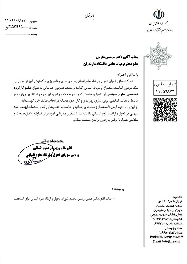 تقدیر قائم مقام وزیر علوم از عضو کارگروه تخصصی علوم سیاسی شورای تحول و ارتقای علوم انسانی - دانشگاه مازندران