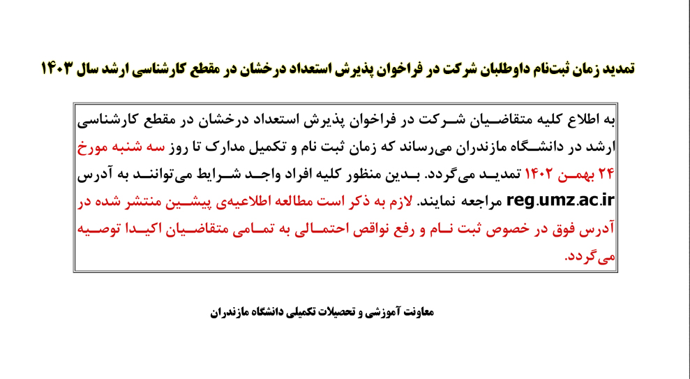 تمدید زمان ثبتنام داوطلبان شرکت در فراخوان پذیرش استعداد درخشان در مقطع کارشناسی ارشد سال 1403 - دانشگاه مازندران