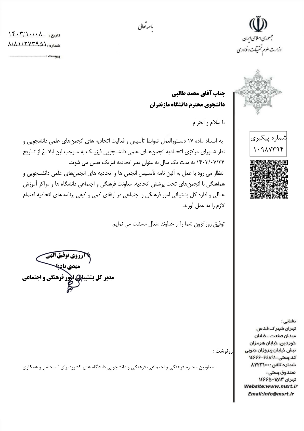 دانشجوی دانشگاه مازندران بهعنوان دبیر اتحادیه فیزیک کشور منصوب شد