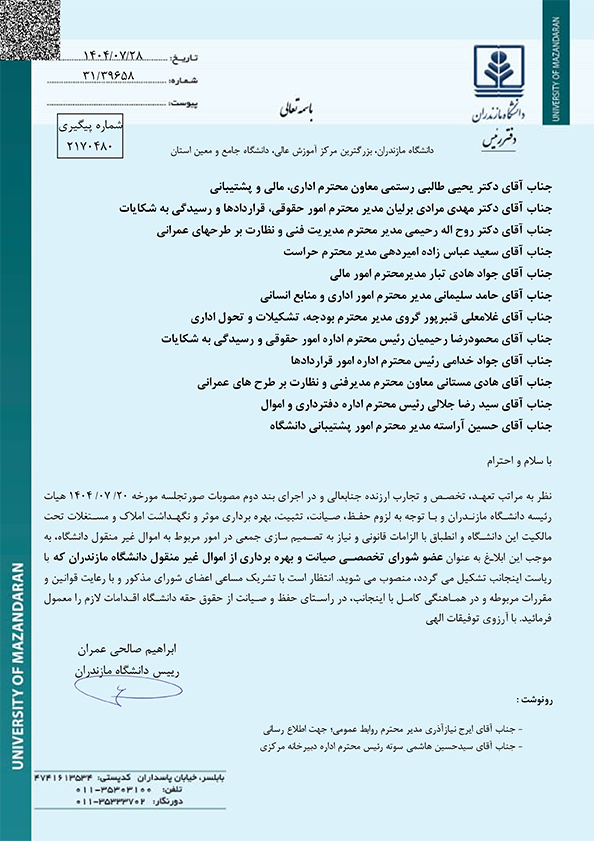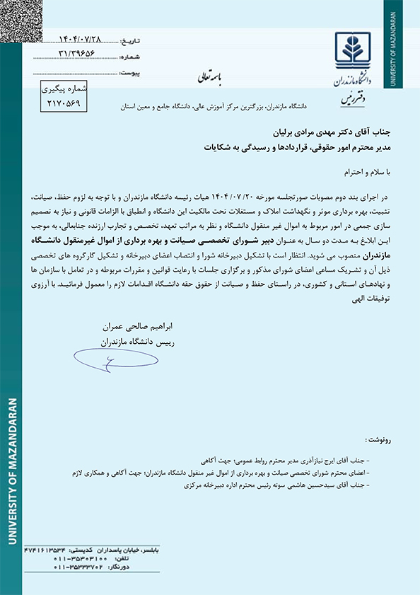 دبیر و اعضای شورای تخصصی صیانت و بهره برداری از اموال غیرمنقول دانشگاه منصوب شدند - دانشگاه مازندران