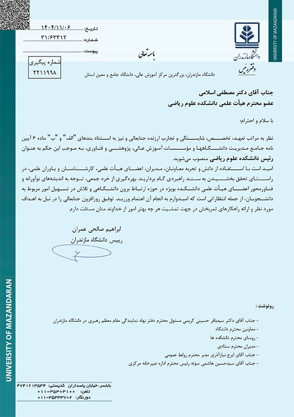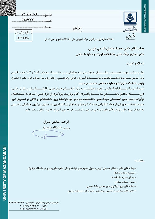 روسای دانشکدههای علوم ریاضی و الهیات و معارف اسلامی دانشگاه مازندران منصوب شدند - دانشگاه مازندران