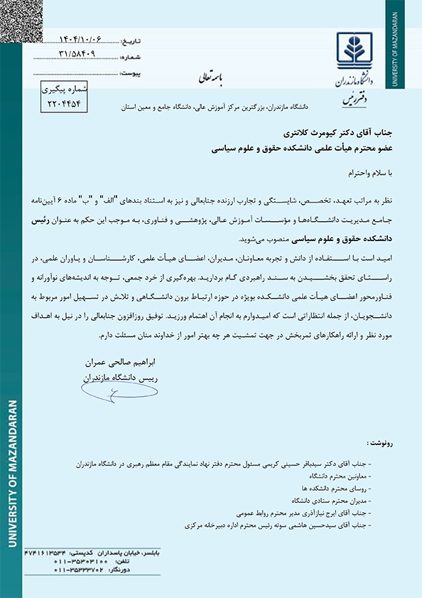 رییس دانشکده حقوق و علوم سیاسی دانشگاه مازندران منصوب شد - دانشگاه مازندران