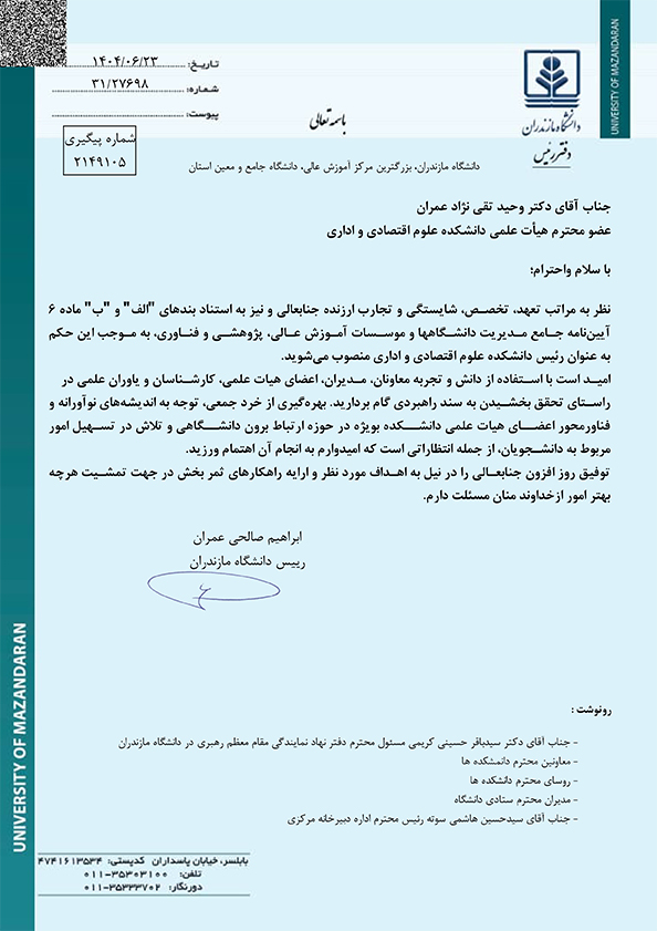 رییس دانشکده علوم اقتصادی و اداری دانشگاه مازندران منصوب شد - دانشگاه مازندران