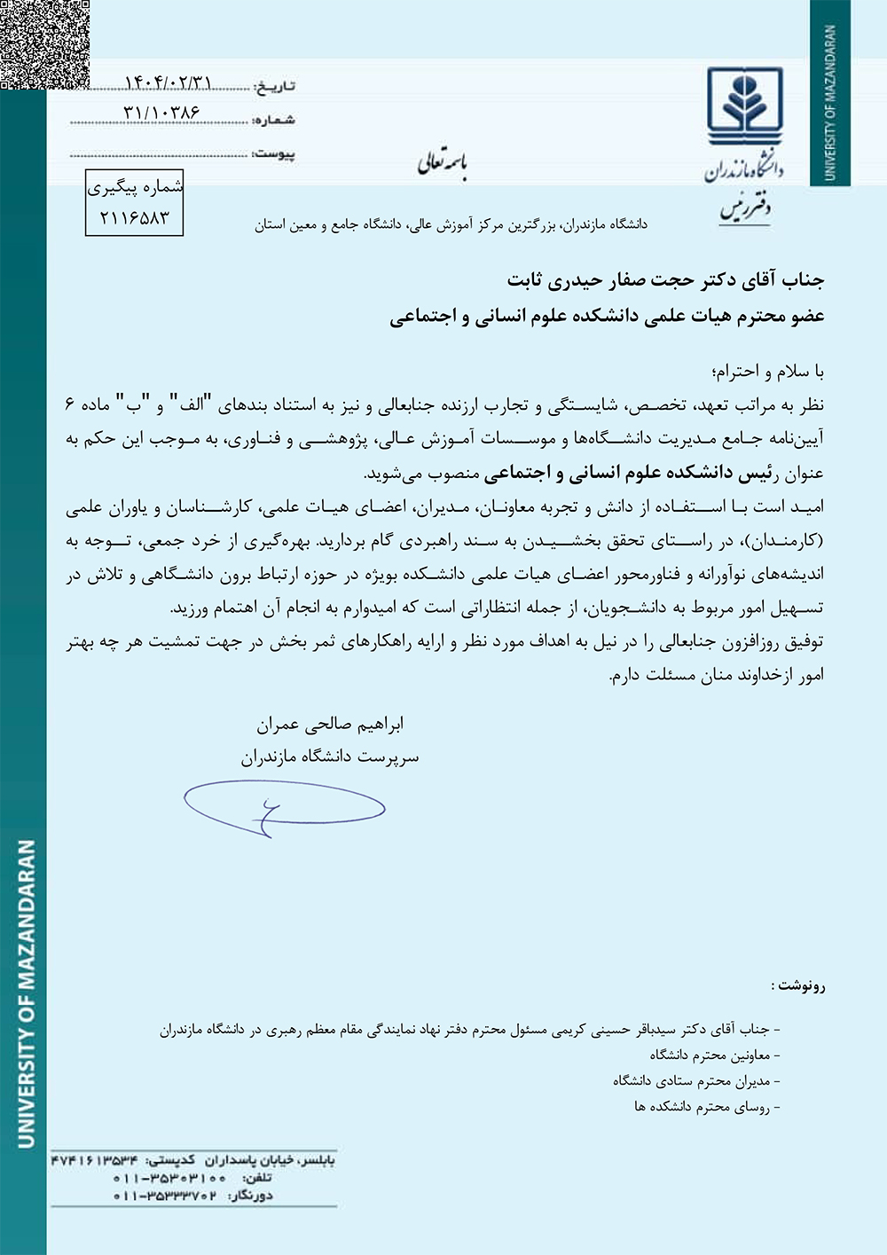 رییس دانشکده علوم انسانی و اجتماعی دانشگاه مازندران منصوب شد - دانشگاه مازندران