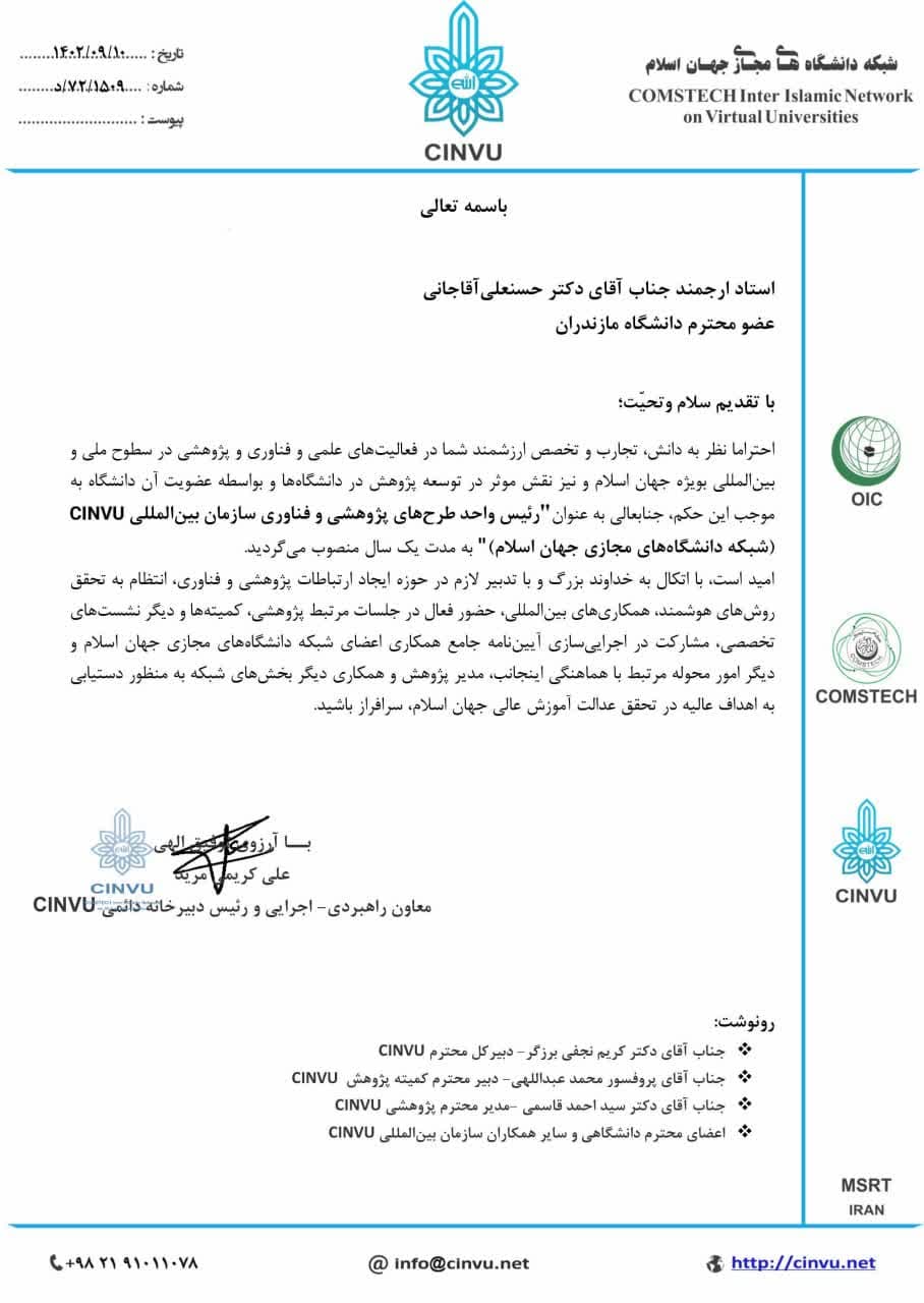 به گزارش روابط عمومی دانشگاه مازندران به نقل از شبکه دانشگاههای مجازی جهان اسلام، طی حکمی از سوی معاون راهبردی اجرایی و رییس دبیرخانه دایمی سازمان بینالمللی سینوو، دکتر حسنعلی آقاجانی عضو هیات علمی دانشگاه مازندران به مدت یک سال به سمت رییس واحد طرحهای پژوهشی فناوری این سازمان بینالمللی علمی و دانشگاهی منصوب گردید.