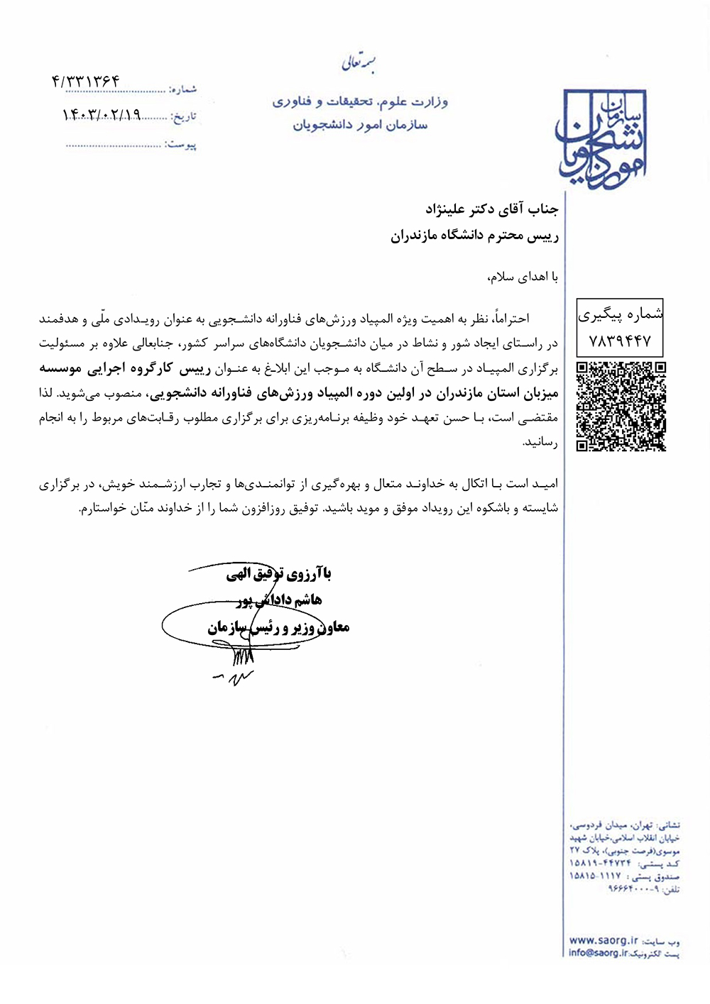 با حکم معاون وزیر و رییس سازمان امور دانشجویان وزارت عتف: