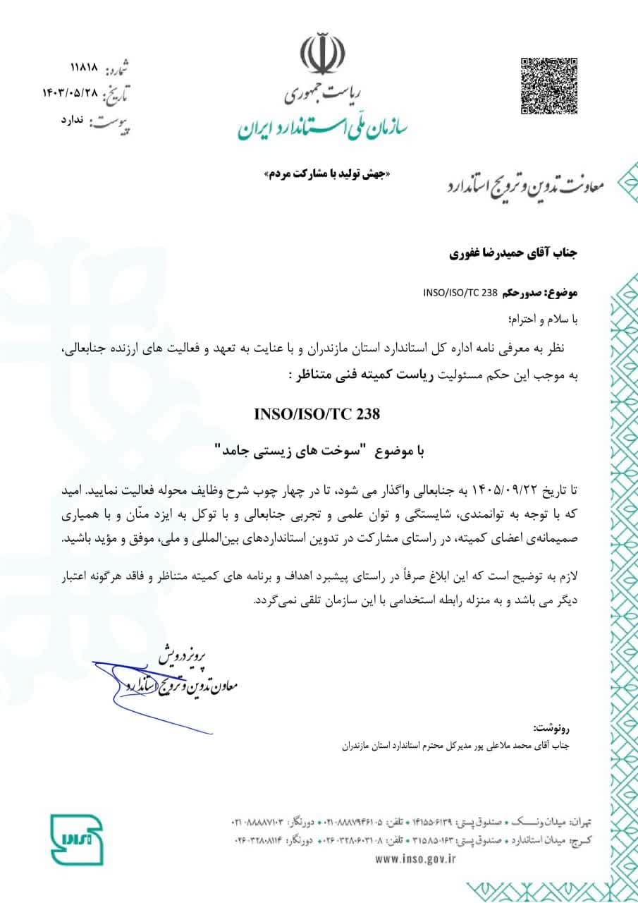 رییس کمیته فنی متناظر INSO/ISO/TC238 با موضوع سوختهای زیستی جامد منصوب شد