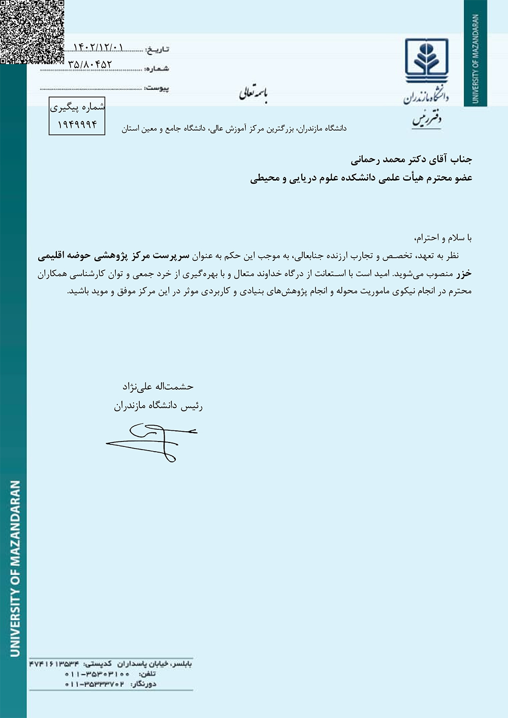 سرپرست مرکز پژوهشی حوضه اقلیمی دانشگاه مازندران منصوب شد