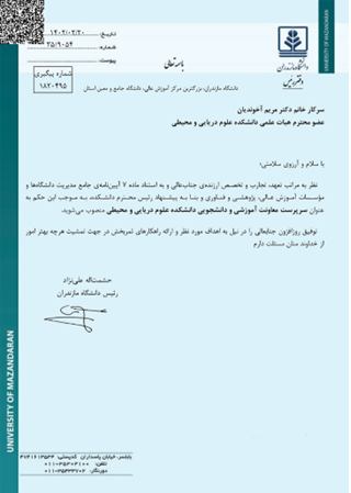 سرپرست معاونت آموزشی و دانشجویی دانشکده علوم دریایی و محیطی دانشگاه مازندران منصوب شد - دانشگاه مازندران