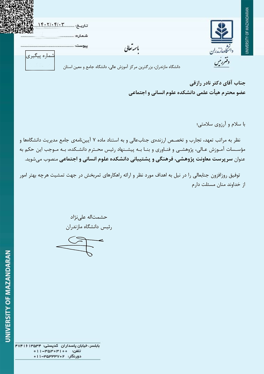 سرپرست معاونت پژوهشی، فرهنگی و پشتیبانی دانشکده علوم انسانی و اجتماعی دانشگاه مازندران منصوب شد - دانشگاه مازندران