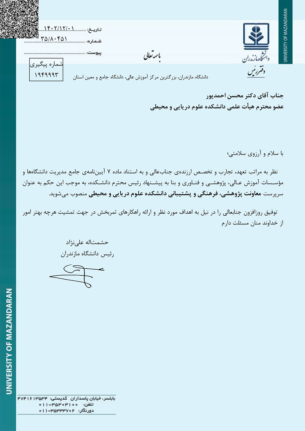 سرپرست معاونت پژوهشی، فرهنگی و پشتیبانی دانشکده علوم دریایی و محیطی دانشگاه مازندران منصوب شد