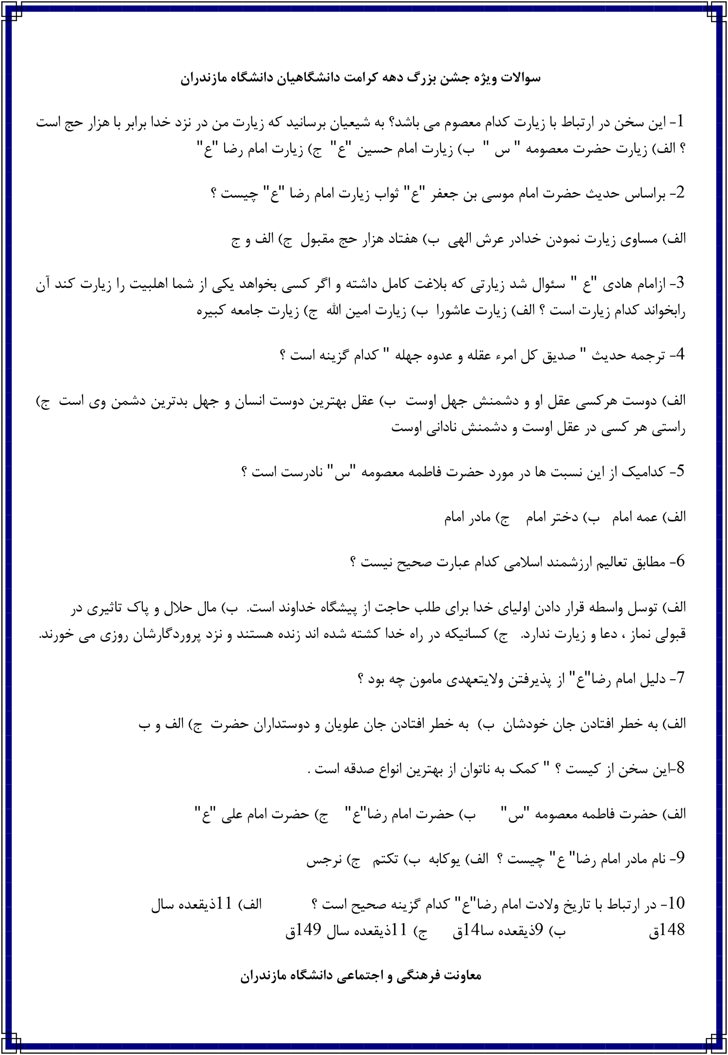 سوالات مسابقه فرهنگی، ویژه جشن بزرگ دهه کرامت دانشگاهیان دانشگاه مازندران