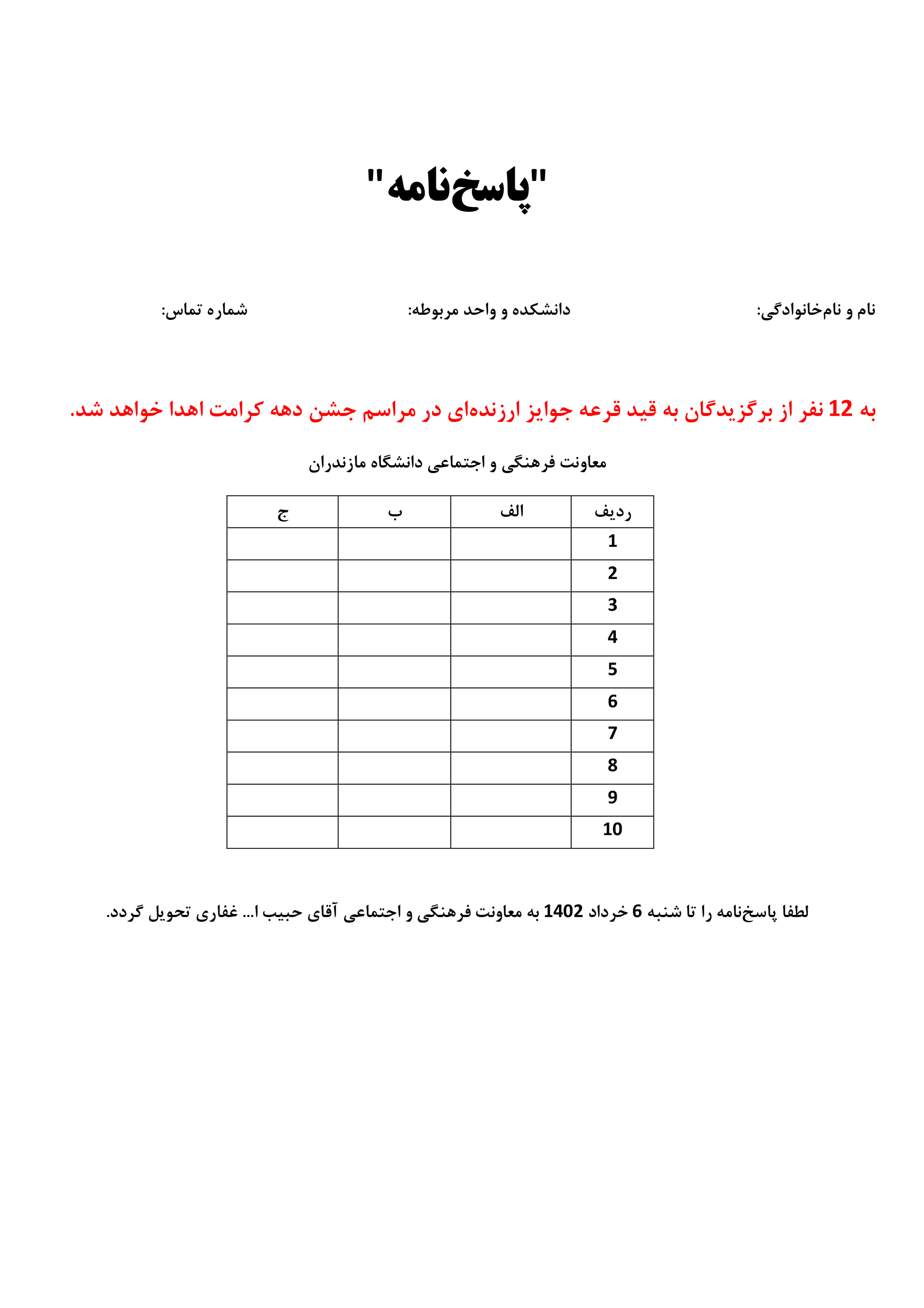 پاسخنامه مسابقه فرهنگی، ویژه جشن بزرگ دهه کرامت دانشگاهیان دانشگاه مازندران
