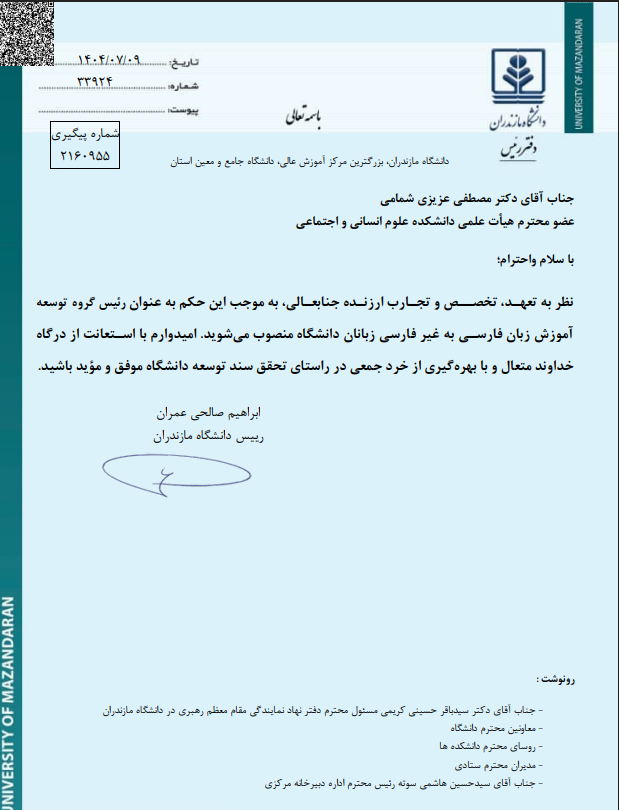 به گزارش روابط عمومی دانشگاه مازندران، طی حکمی از سوی دکتر ابراهیم صالحی عمران رییس دانشگاه، دکتر مصطفی عزیزی شمامی را به عنوان رئیس گروه توسعه آموزش زبان فارسی به غیر فارسی زبانان منصوب کرد.