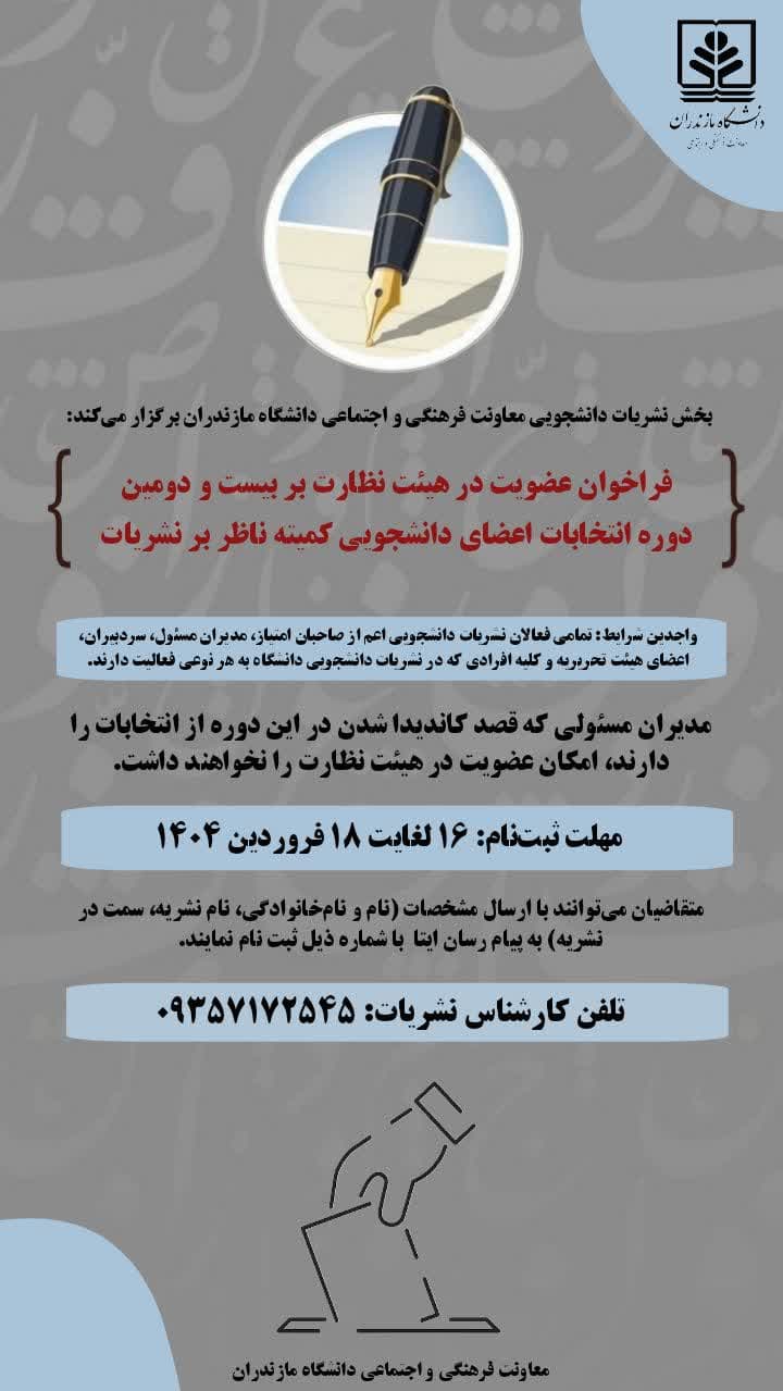 فراخوان عضویت در هیات نظارت بر بیستودومین دوره انتخابات اعضای دانشجویی کمیته ناظر بر نشریات - دانشگاه مازندران
