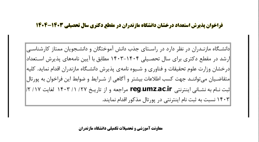 فراخوان پذیرش استعداد درخشان دانشگاه مازندران در مقطع دکتری سال تحصیلی 1404-1403