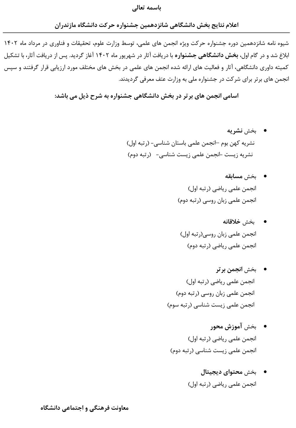 فهرست انجمنهای علمی برتر در بخشهای مختلف جشنواره حرکت اعلام شد - دانشگاه مازندران
