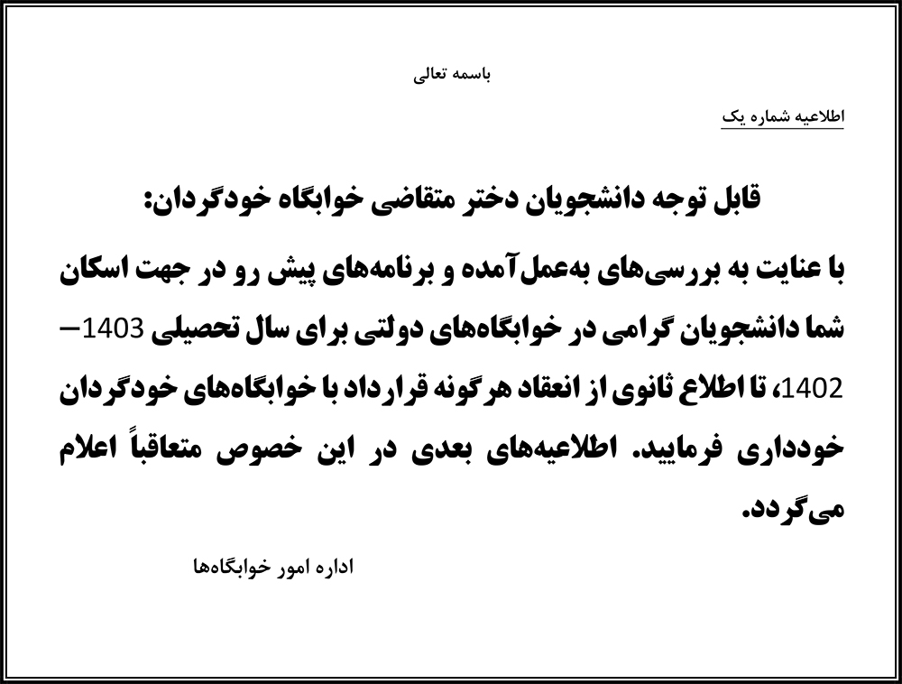 قابل توجه دانشجویان دختر متقاضی خوابگاه خودگردان