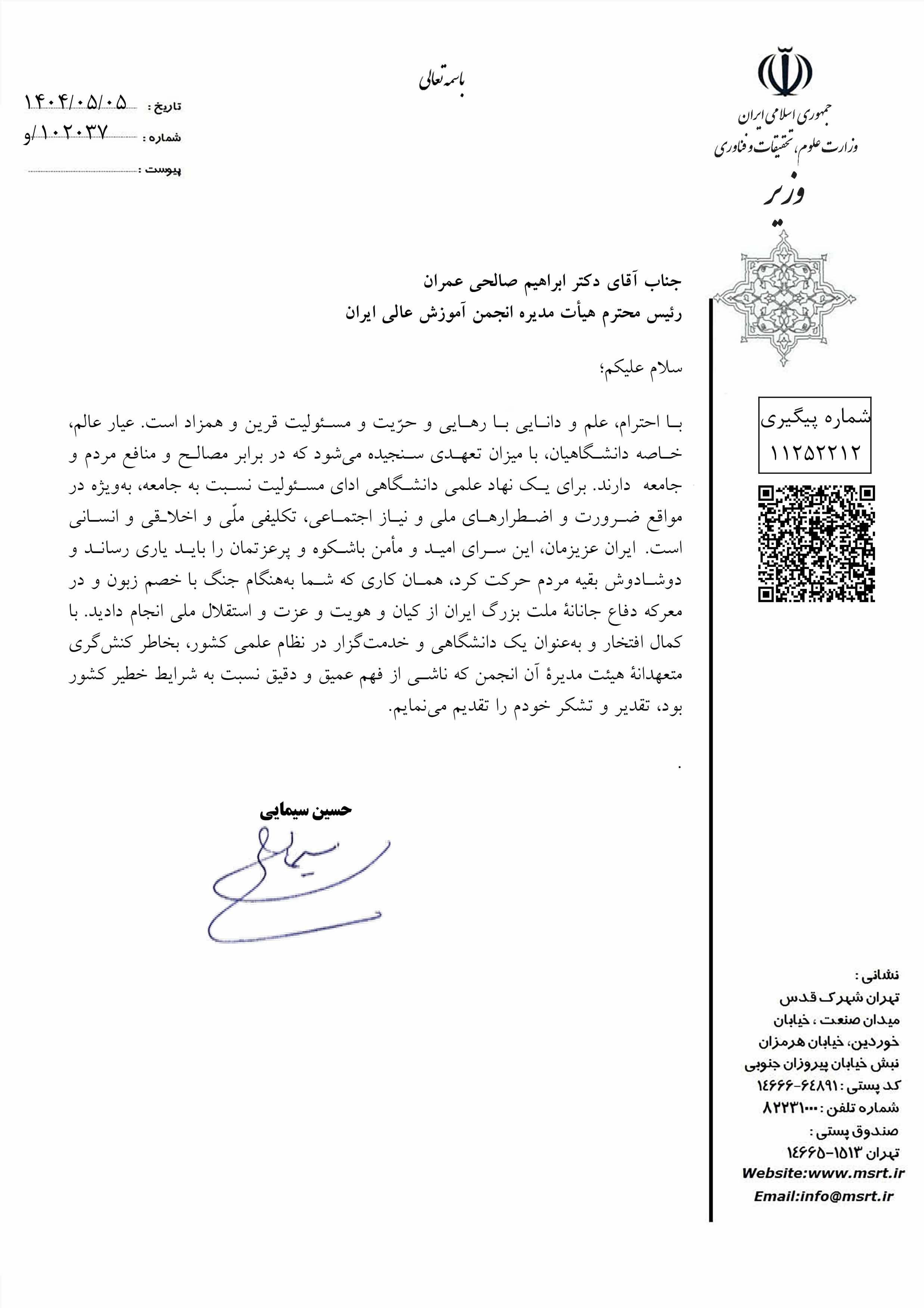در زیر، متن ارسالی وزیر علوم، تحقیقات و فناوری را مشاهده میکنید: