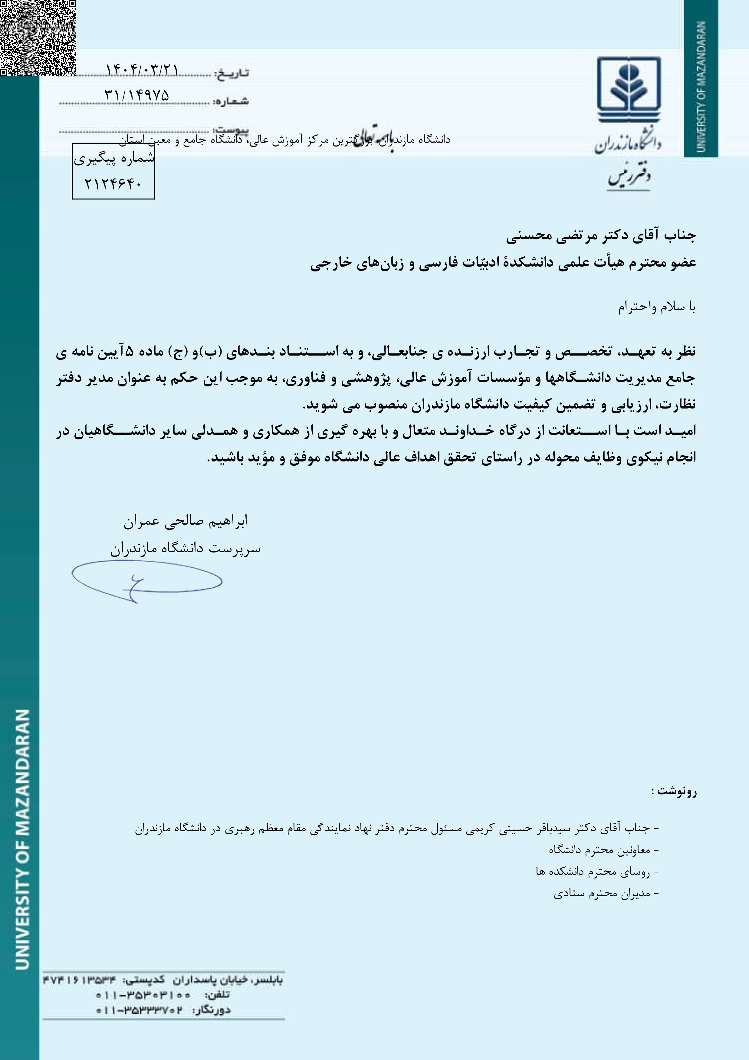 مدیر نظارت، ارزیابی و تضمین کیفیت دانشگاه مازندران منصوب شد - دانشگاه مازندران