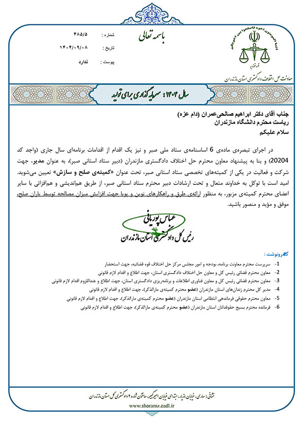 مدیر کمیته صلح و سازش ستاد استانی صبر دادگستری استان مازندران منصوب شد - دانشگاه مازندران