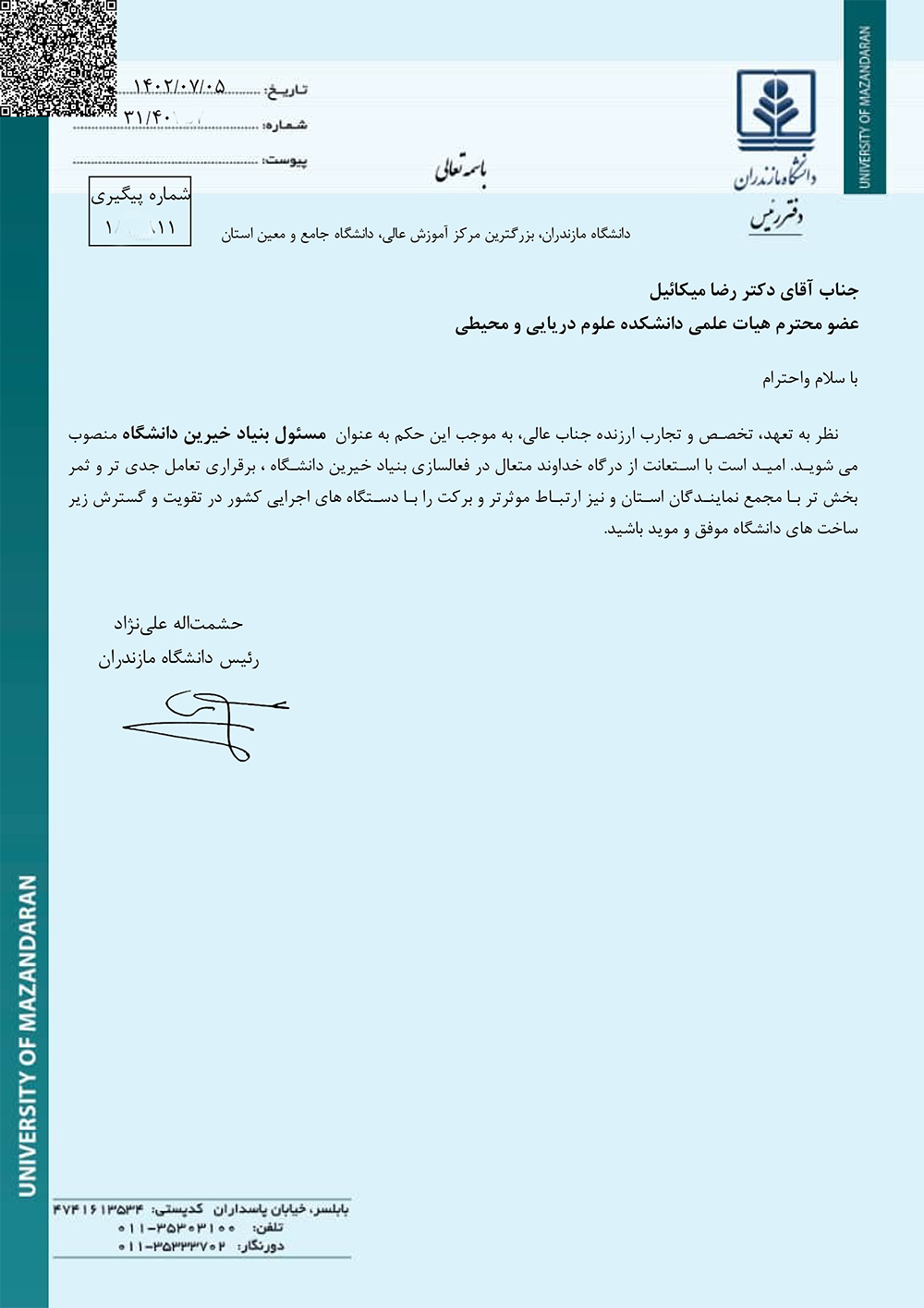 مسئول بنیاد خیرین دانشگاه مازندران منصوب شد - دانشگاه مازندران