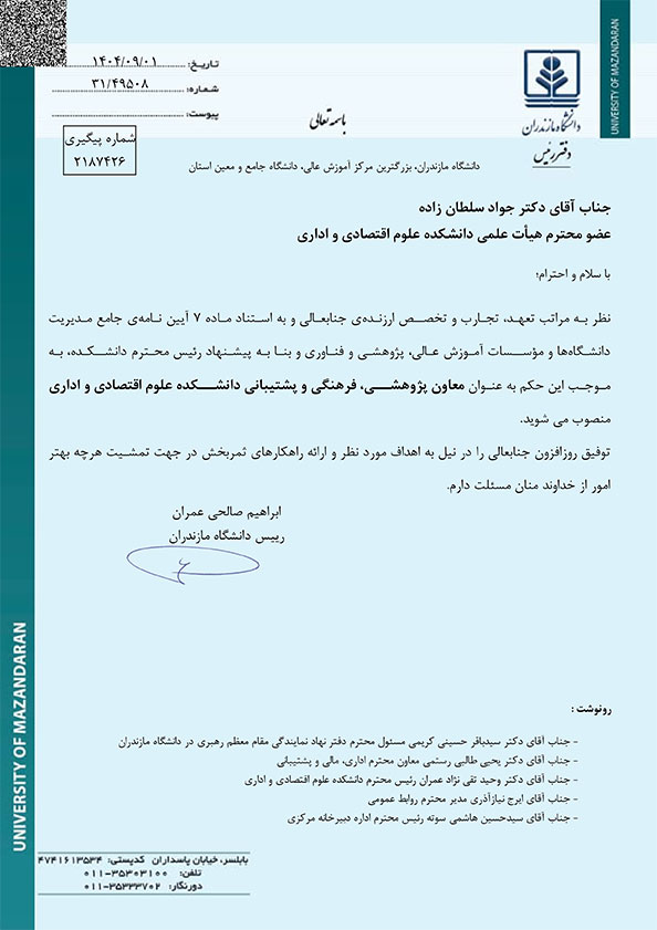 به گزارش روابط عمومی دانشگاه مازندران، دکتر ابراهیم صالحی عمران رییس دانشگاه، طی احکام جداگانهای دکتر محمد عبدی سیدکلائی عضو هیات علمی دانشکده علوم اقتصادی و اداری را به عنوان معاون آموزشی و دانشجویی و دکتر جواد سلطانزاده عضو هیات علمی دانشکده علوم اقتصادی و اداری را به عنوان معاون پژوهشی، فرهنگی و پشتیبانی این دانشکده و همچنین دکتر ایرج اسدی عضو هیات علمی دانشکده هنر و معماری را به عنوان معاون پژوهشی، فرهنگی و پشتیبانی دانشکده هنر و معماری دانشگاه مازندران منصوب کرد.