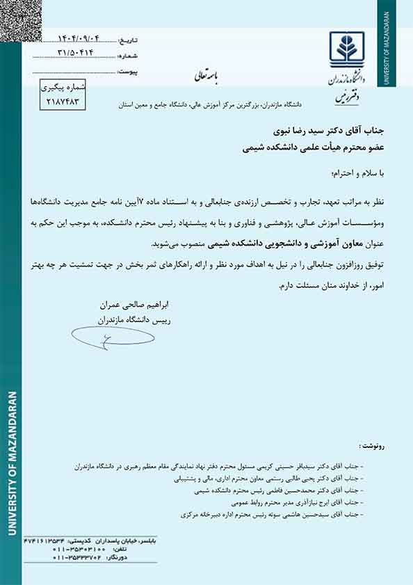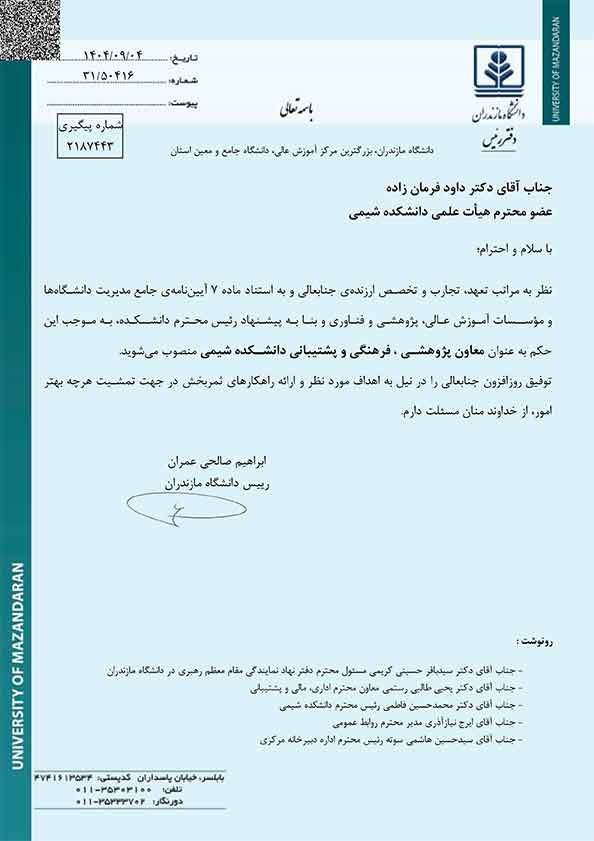 معاونان آموزشی و دانشجویی و معاون پژوهشی و فرهنگی دانشکدههای شیمی دانشگاه مازندران منصوب شدند - دانشگاه مازندران