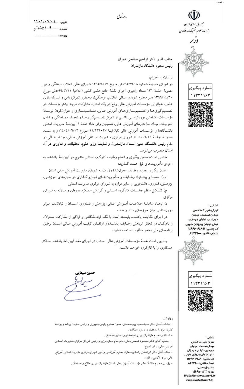نماینده وزير علوم، تحقيقات و فناوري و رییس دانشگاه معین استان مازندران منصوب شد
