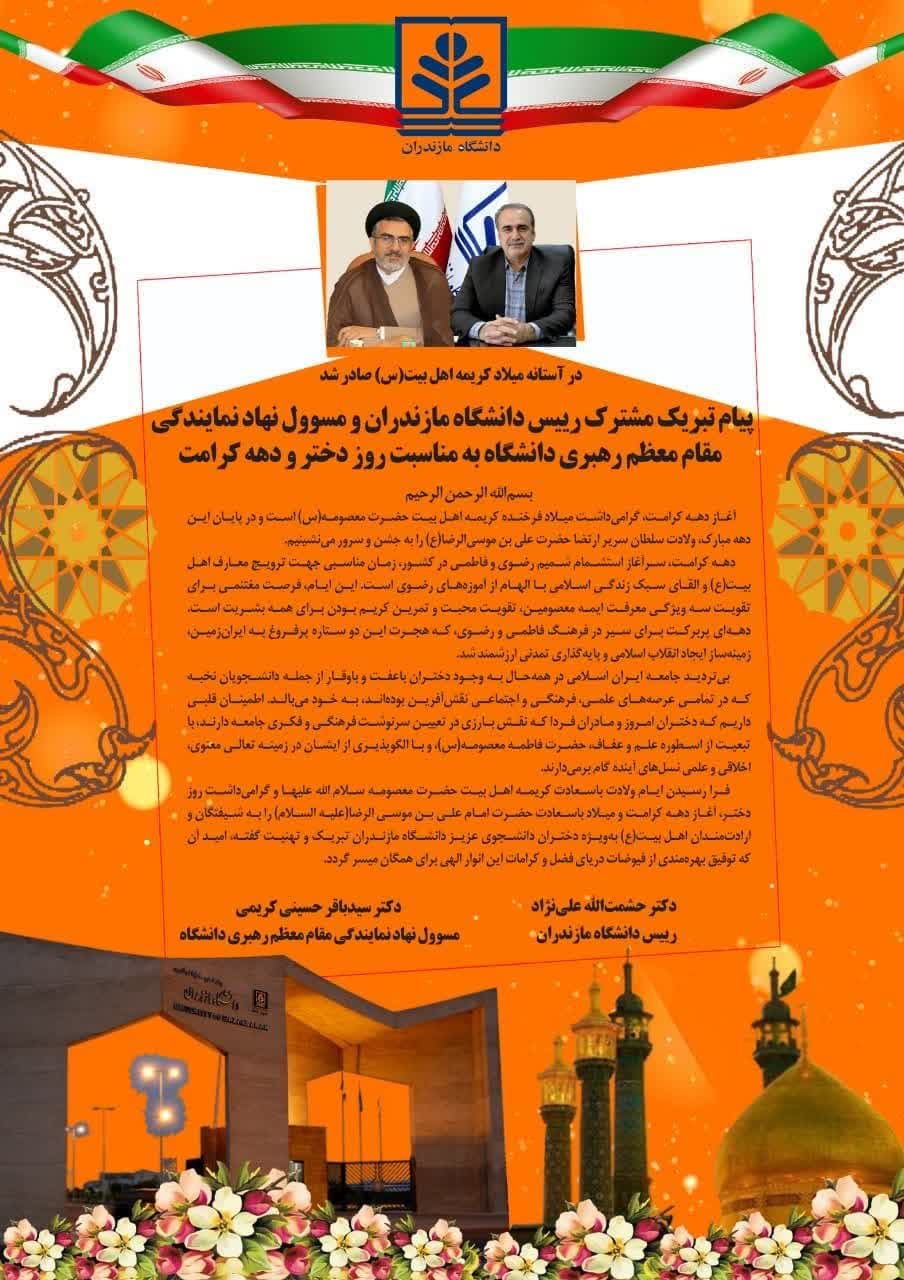 پیام تبریک مشترک رییس دانشگاه مازندران و مسوول نهاد نمایندگی مقام معظم رهبری دانشگاه به مناسبت روز دختر و دهه کرامت