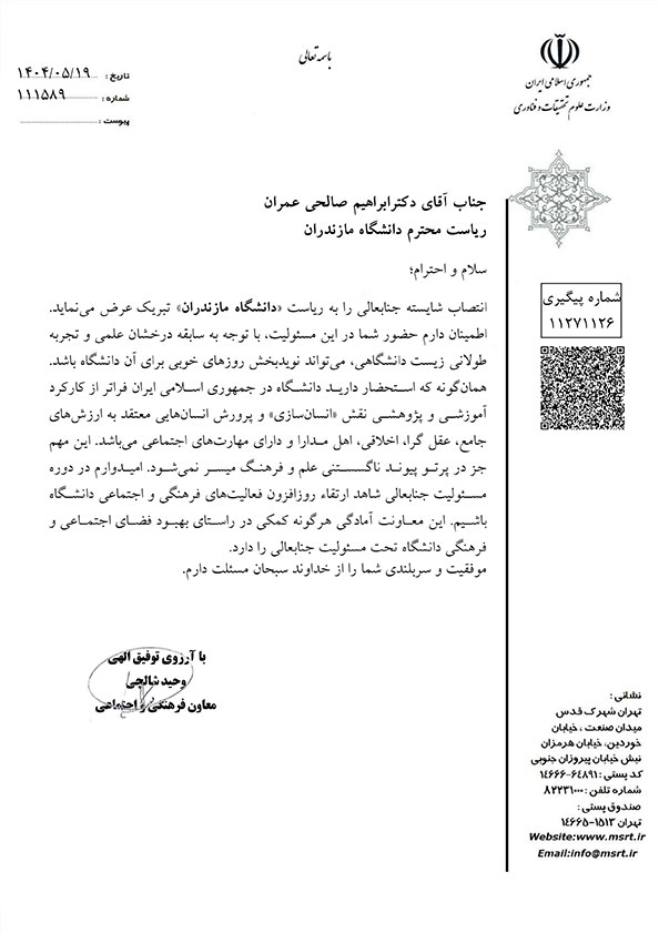 پیام تبریک معاون فرهنگی و اجتماعی وزارت علوم، تحقیقات و فناوری به رییس دانشگاه مازندران