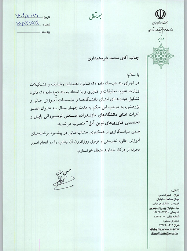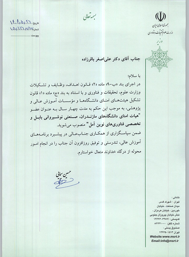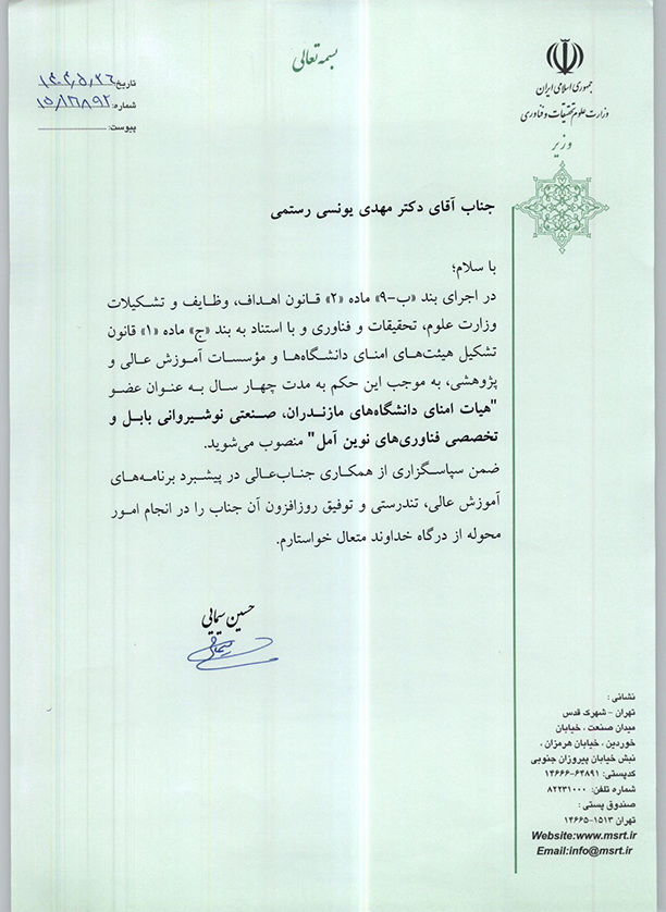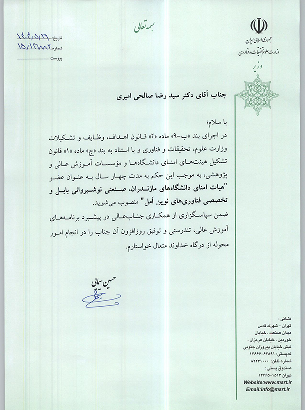 بر اساس این گزارش، وزیر علوم بر اساس بند"ج" ماده"1" قانون تشکیل هیات امنای دانشگاهها، موسسات آموزش عالی و پژوهشی، اعضای حقیقی جدید هیات امنای دانشگاههای مازندران، صنعتی نوشیروانی بابل و تخصصی فناوریهای نوین آمل را منصوب کرد.