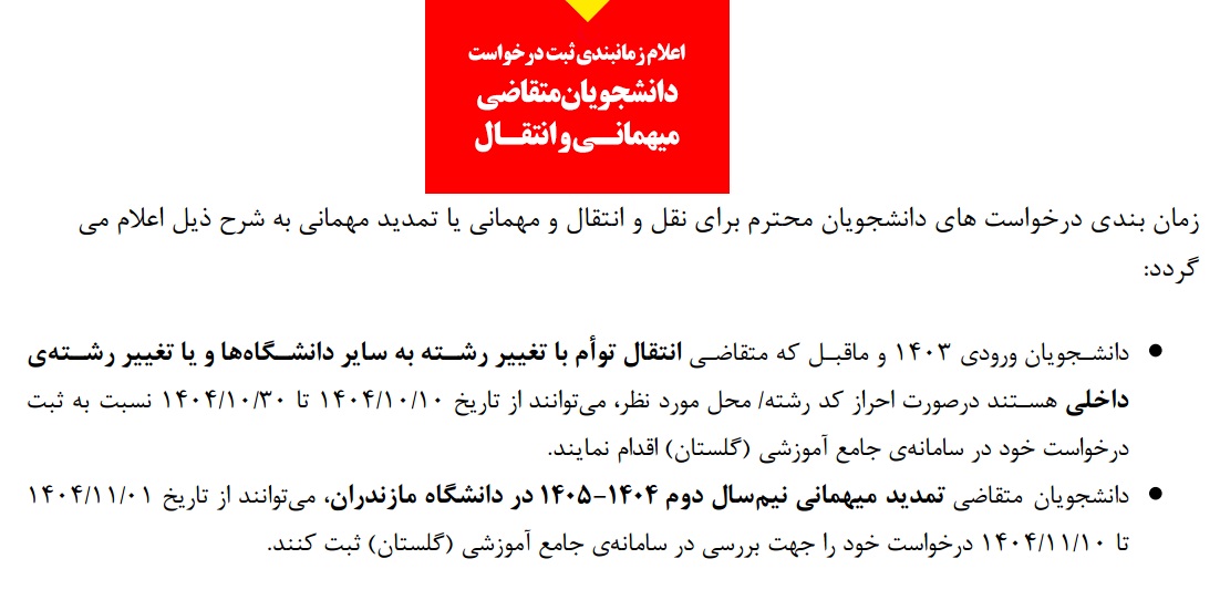 زمانبندی درخواست نقل و انتقال/مهمانی - دانشکده تربیت بدنی و علوم ورزشی